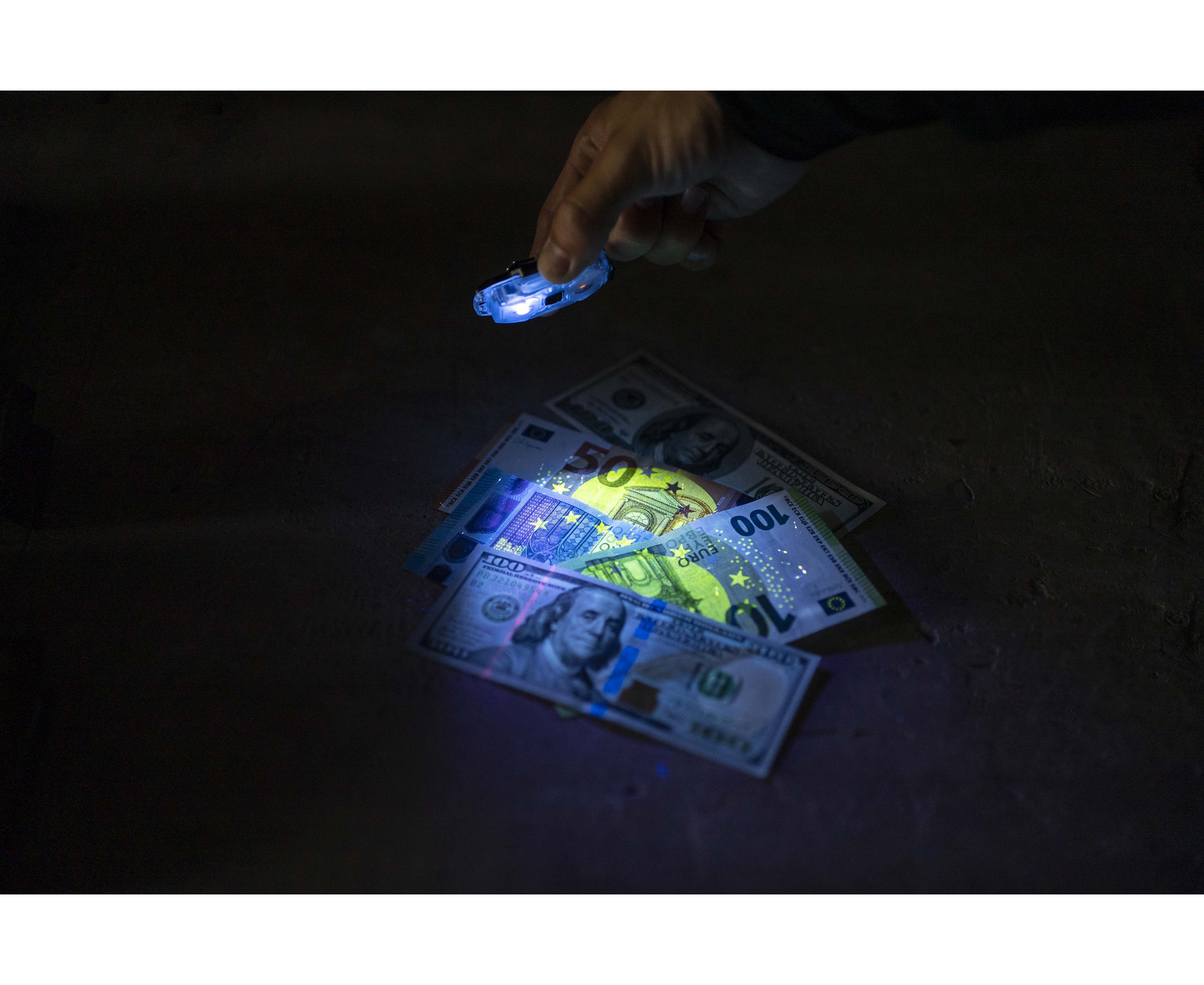 Crystal Pro UV can be used as a headlamp, attached to a belt or clothes, including specialized uniforms, carried on a strap or with keys. The model is also mounted on sporting gear using silicone rings. Body material and special arrangement of LEDs provide wide beam angle of 180°, optimal for close-range application.