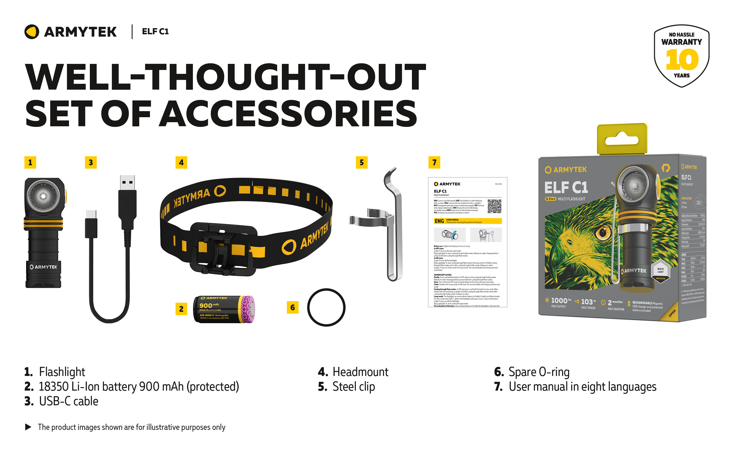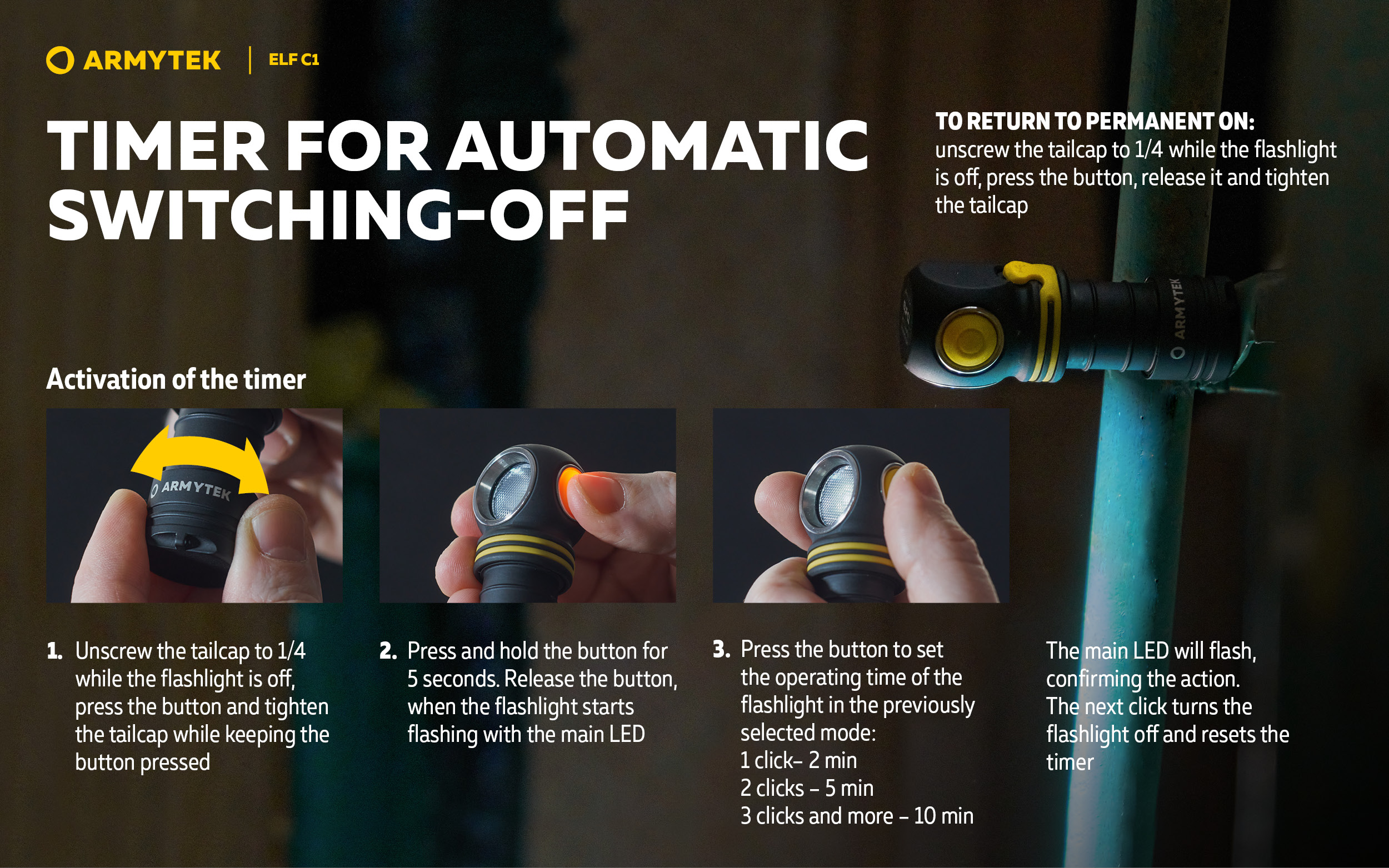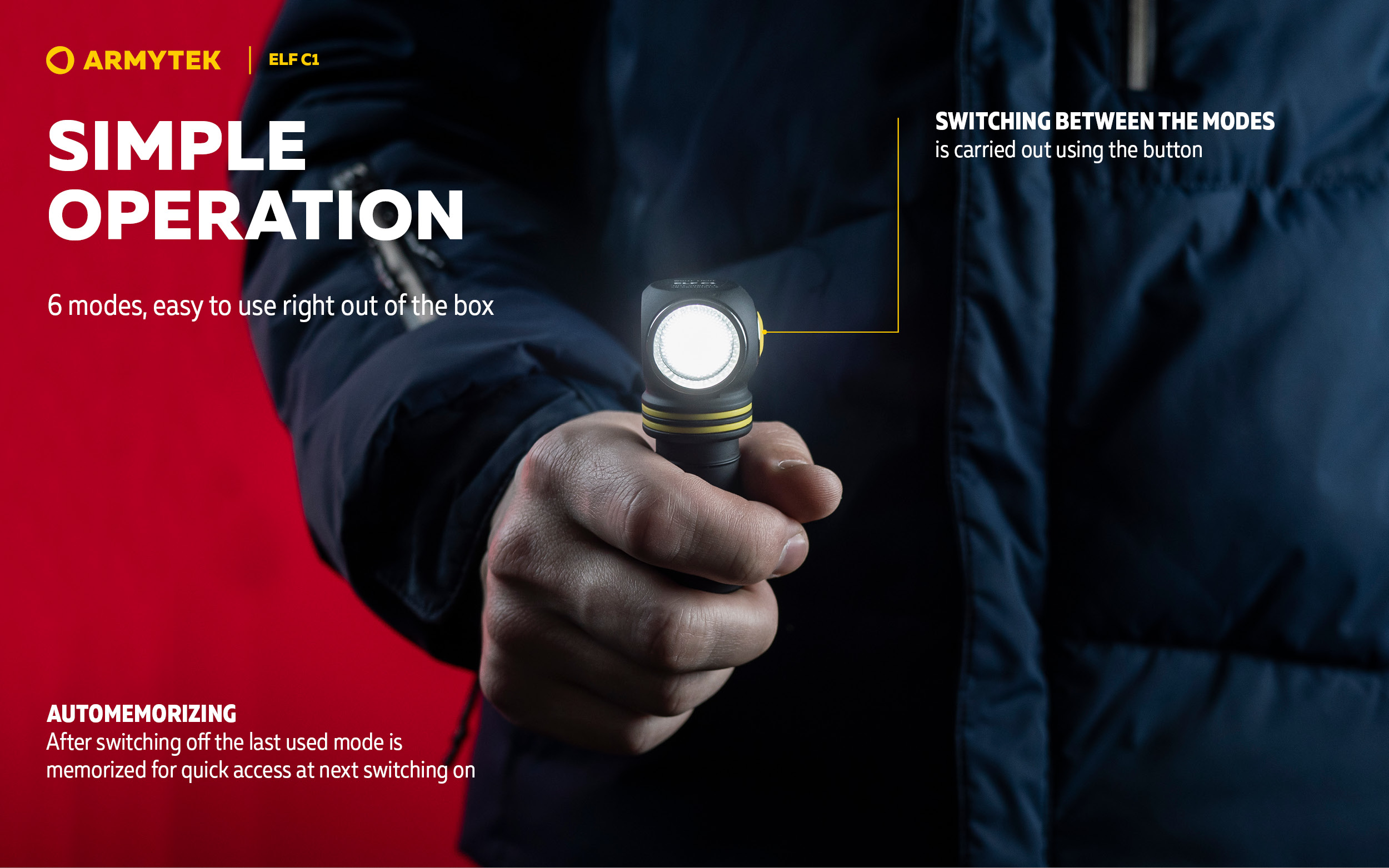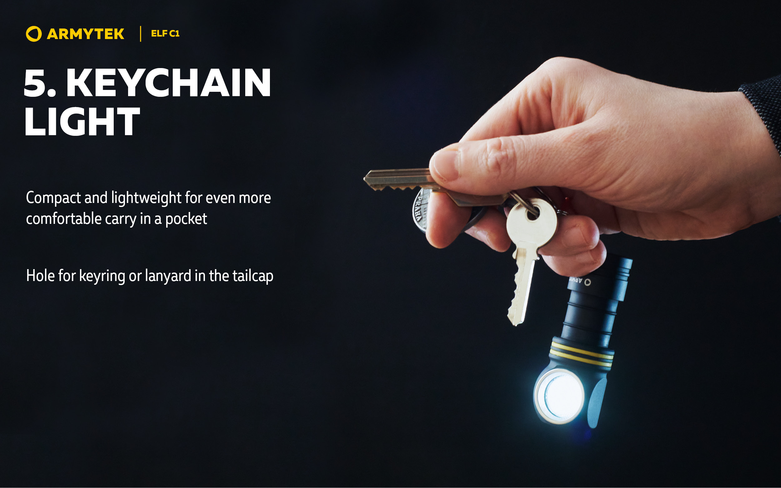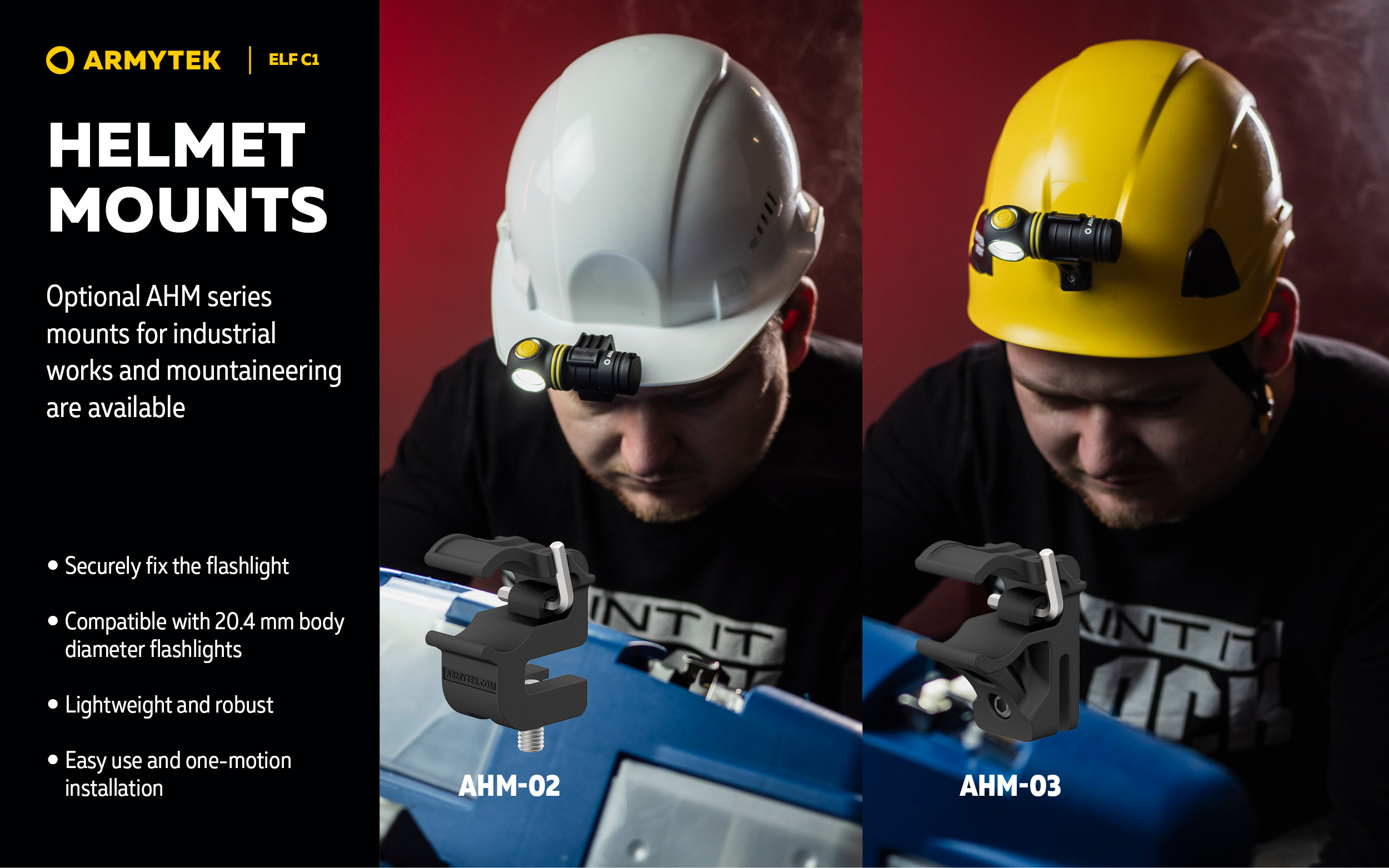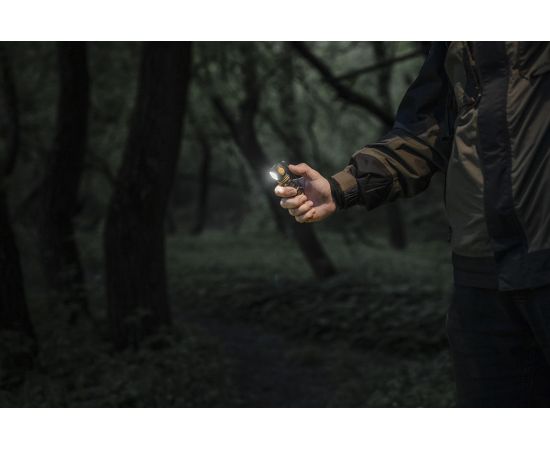 The flashlight can be used together with a headmount, fixed to clothes with a clip, as well as installed on metal surfaces thanks to the built-in magnet. Moreover, a special hole in the tailcap allows carrying Elf C1 along with the keys. The model is also compatible with optional accessories: with the ABM-01 bicycle mount for cycling and with the AHM series hard hat mounts for industrial works and mountaineering.