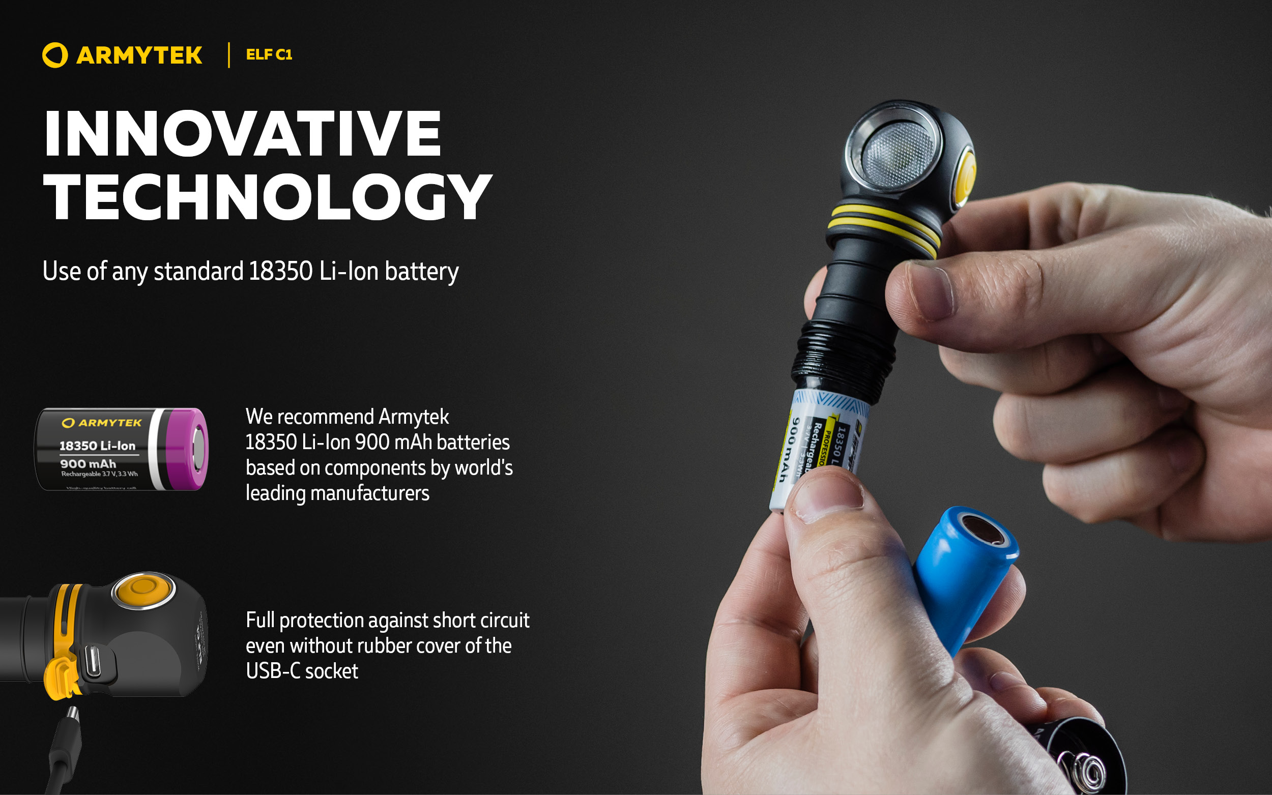 - Innovative technology allows using any standard 18350 Li-Ion battery even without additional protection circuit board.