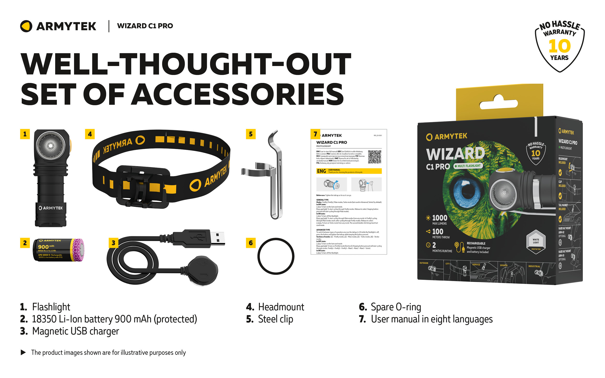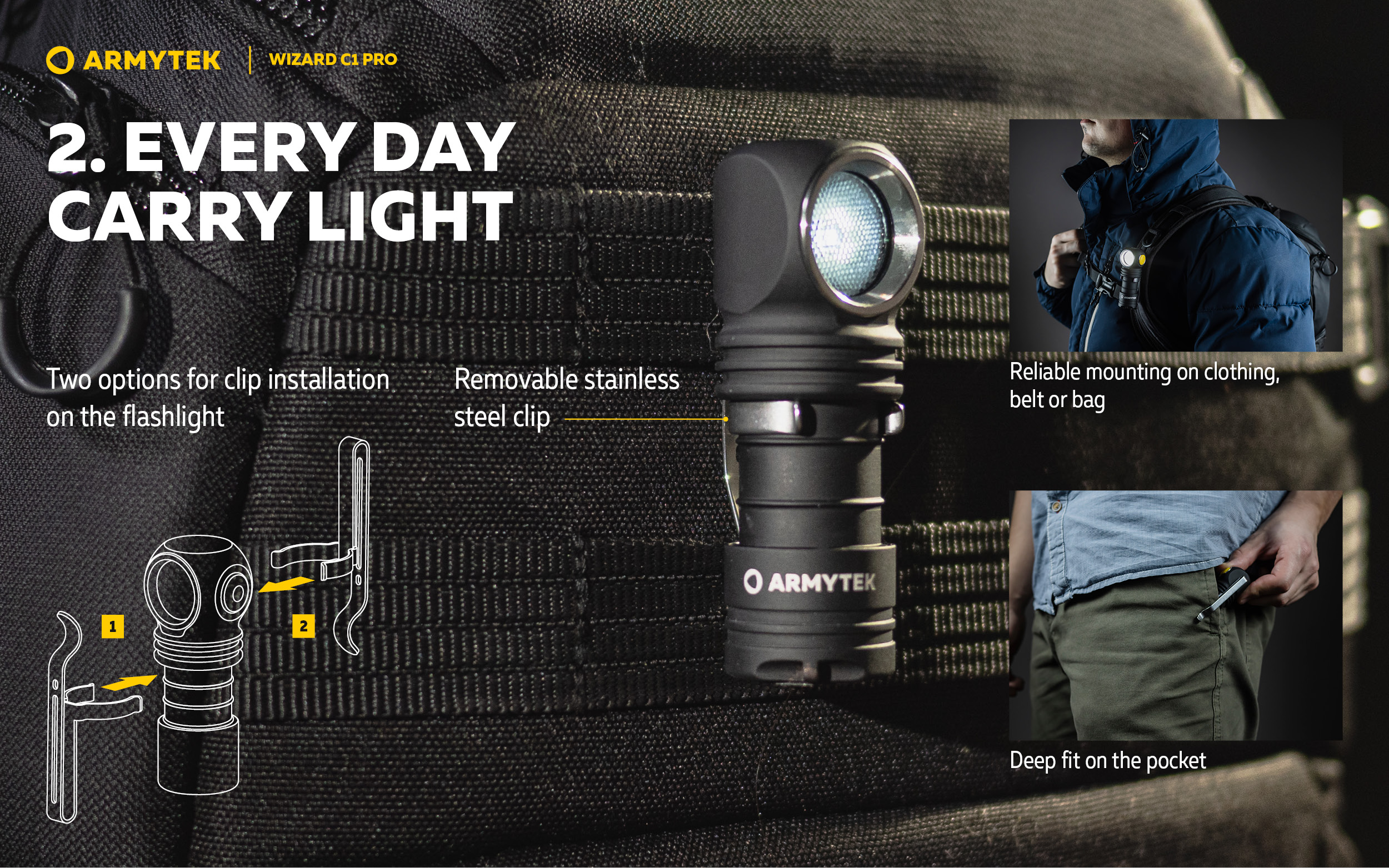 Wizard C1 Pro is attached to metal surfaces with a powerful magnet in the tailcap, securely fixed in the headmount and placed in any position on clothes, belt or bag using a clip. Moreover, there is a hole for lanyard or a key ring in the tailcap. The model is also compatible with bicycle mount ABM-01 and hard hat mount AHM-02.