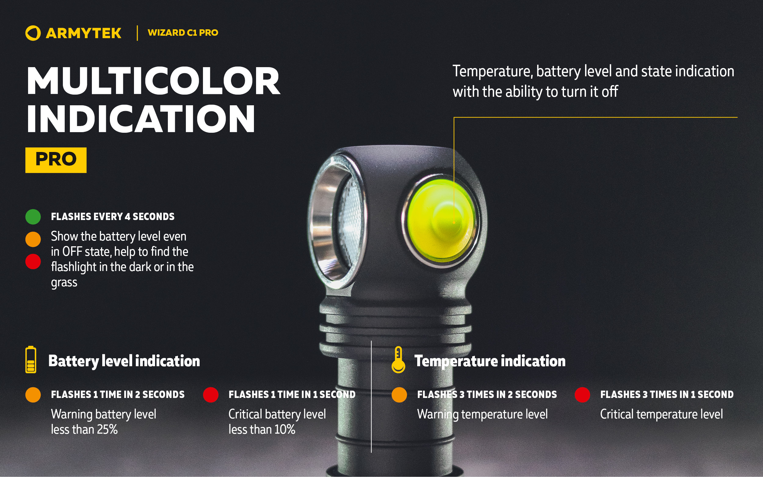 - Pro Multicolor temperature, battery level and state indication with the ability to turn off the latter.