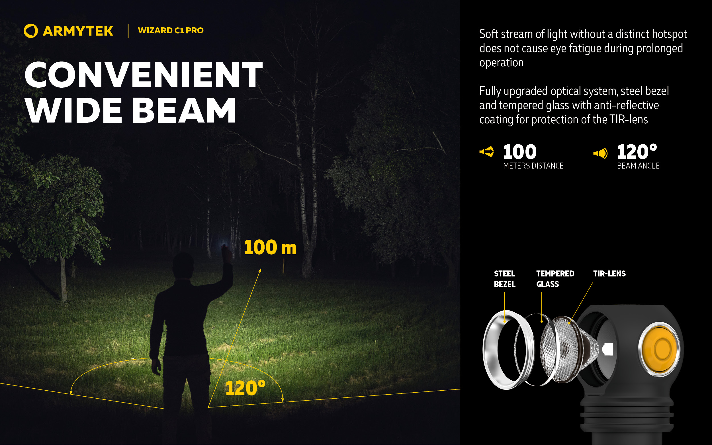 - Convenient wide beam of fully upgraded optical system, TIR-lense is protected from scratches by tempered glass with anti-reflective coating.