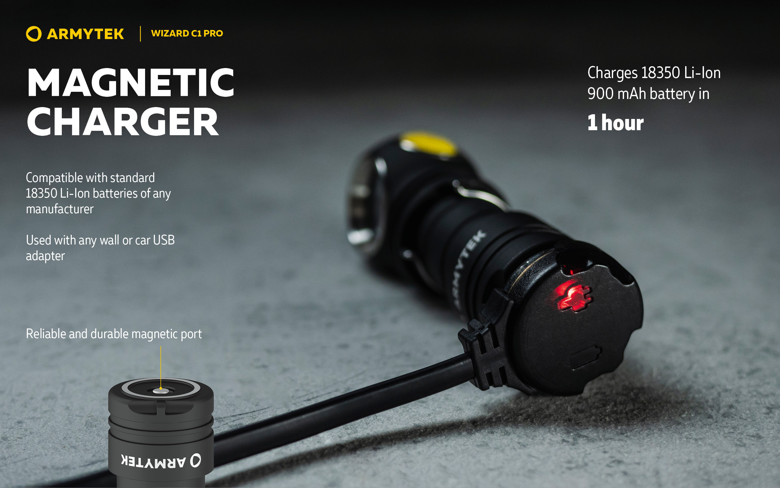 New magnetic charger: the flashlight charges 2 times faster (1 h).