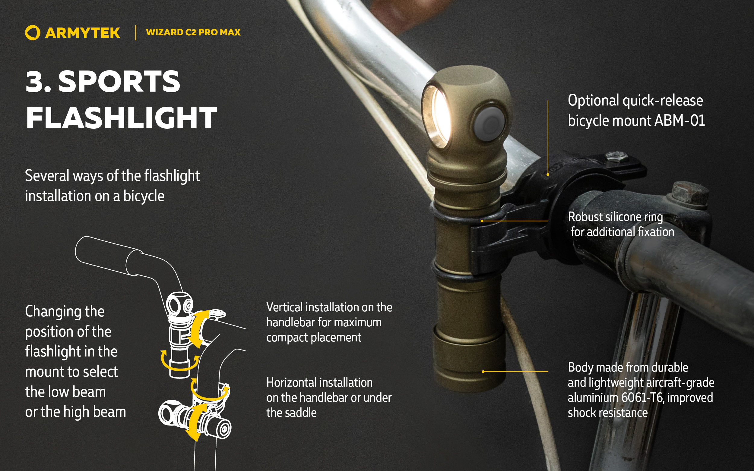 - Multiple variants of installation, optional accessories for mounting on sporting gear