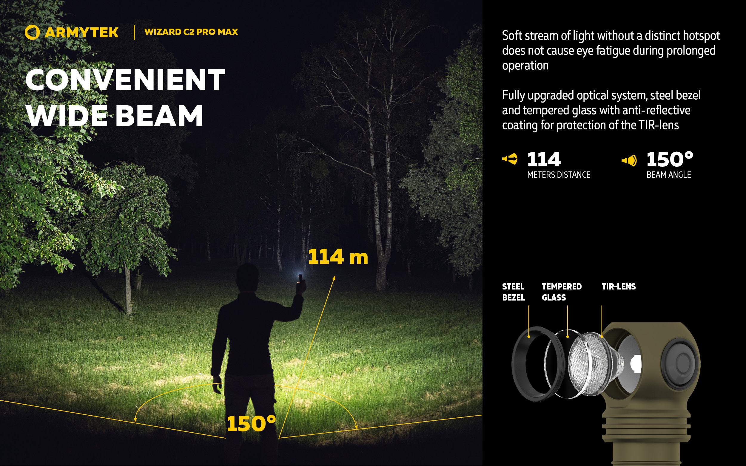 - Convenient wide beam of fully upgraded optical system, steel bezel and tempered glass with anti-reflective coating for protection of the TIR-lens.