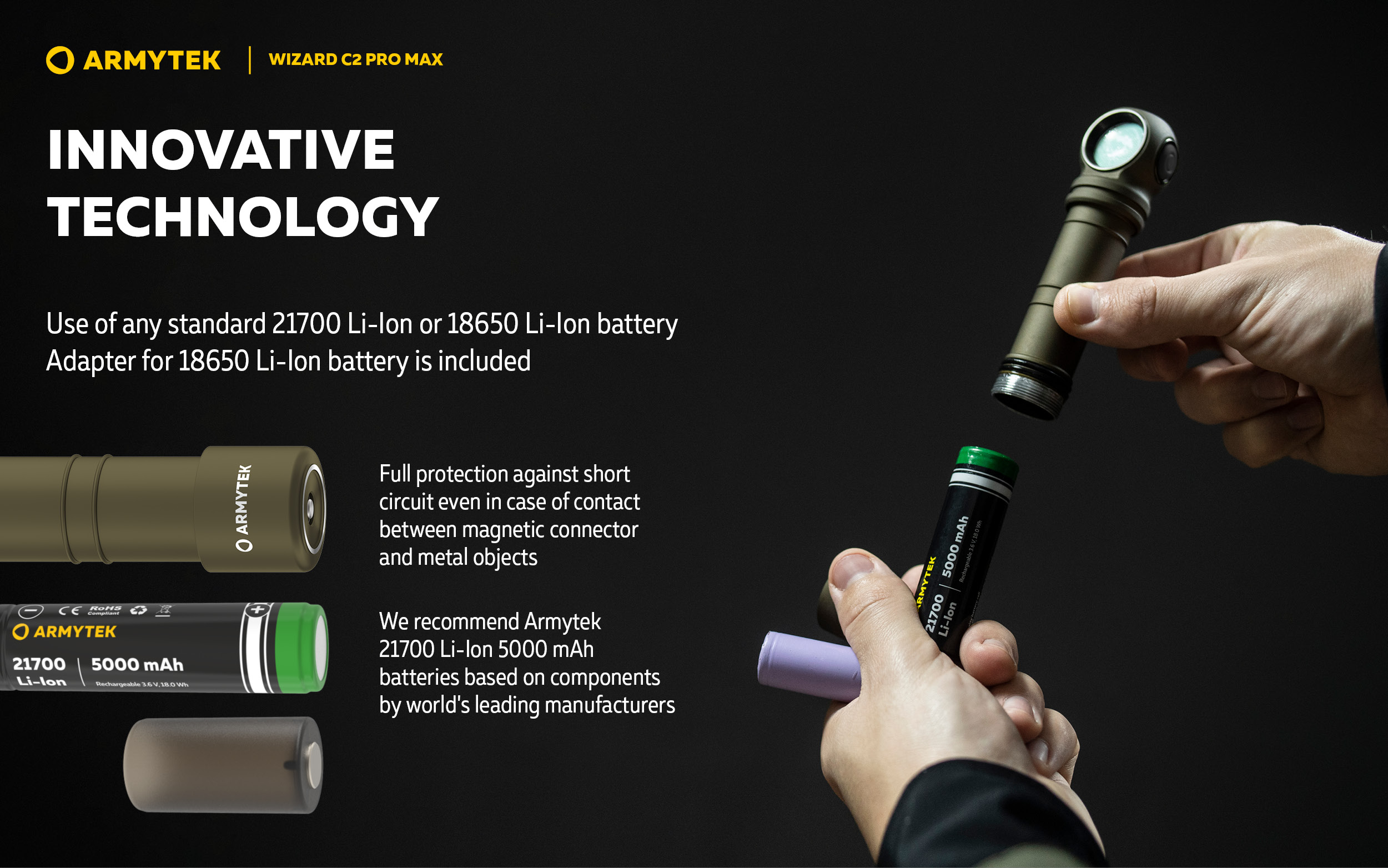 - Innovative technology allows using any standard 21700 Li-Ion or 18650 Li-Ion battery with 15A discharge current. Full protection against short circuit even in case of contact between magnetic connector and metal objects.