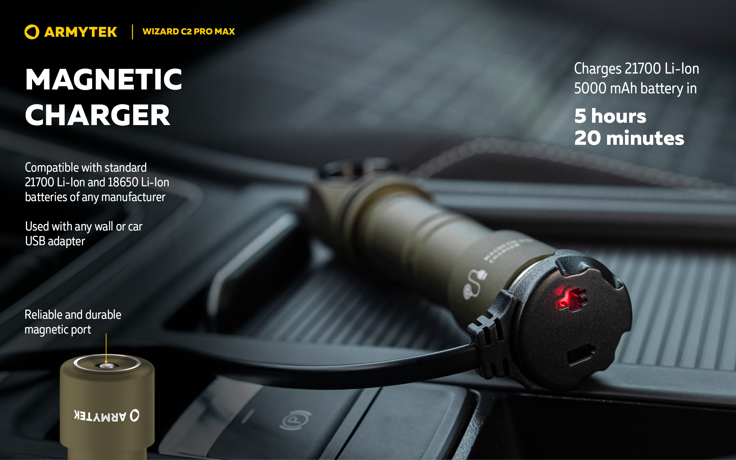 Fast magnetic charger: included 21700 Li-Ion 5000 mAh battery is charged in 5 h 20 min.