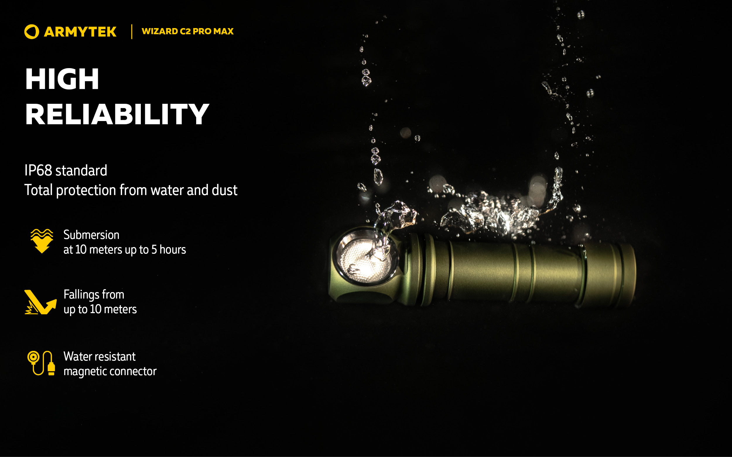 - Total protection from water, dirt and dust in accordance with IP68 standard — flashlight continues to work even after submersion at 10 meters depth. Withstands fallings from up to 10 meters.