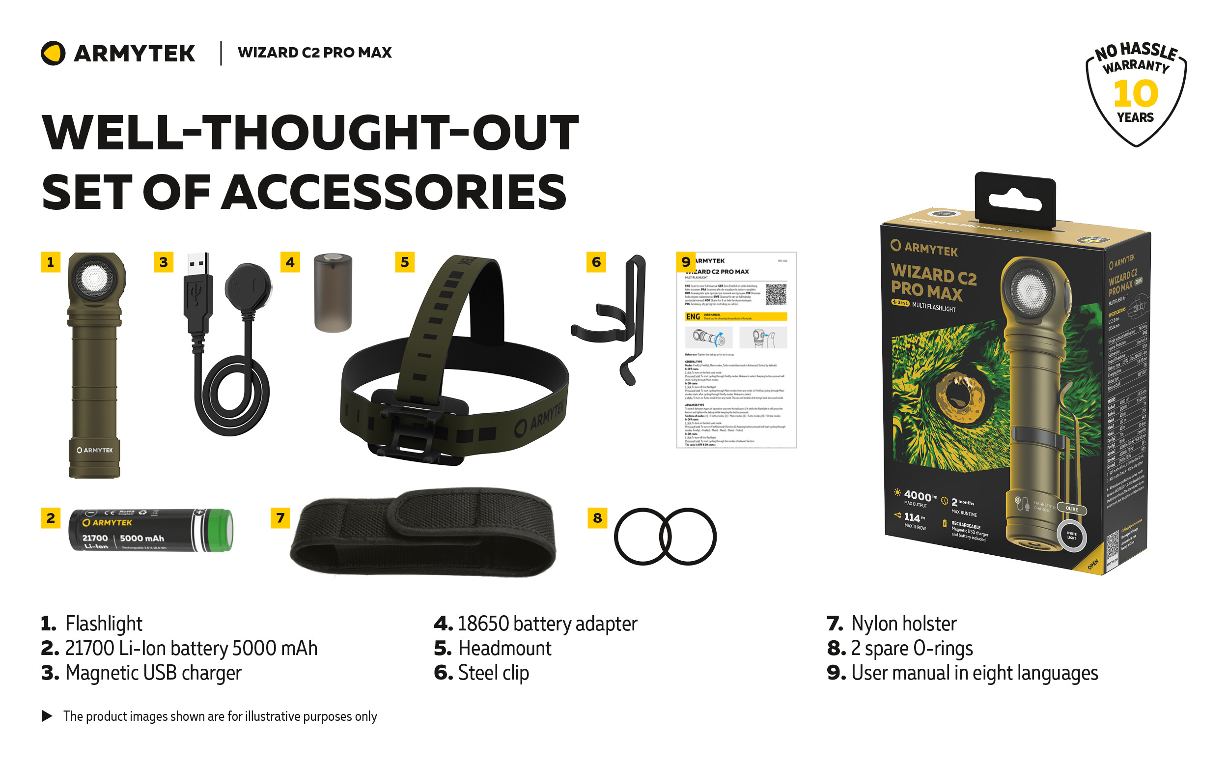 Thanks to the battery adapter in the set, the flashlight also works on the common 18650 Li-Ion power supply. Headmount, clip, holster, magnet in the tailcap and optional bike mount ABM-01 provide various attachment options. Wizard C2 Pro Max is also compatible with original hard hat mounts for industrial works and mountaineering.