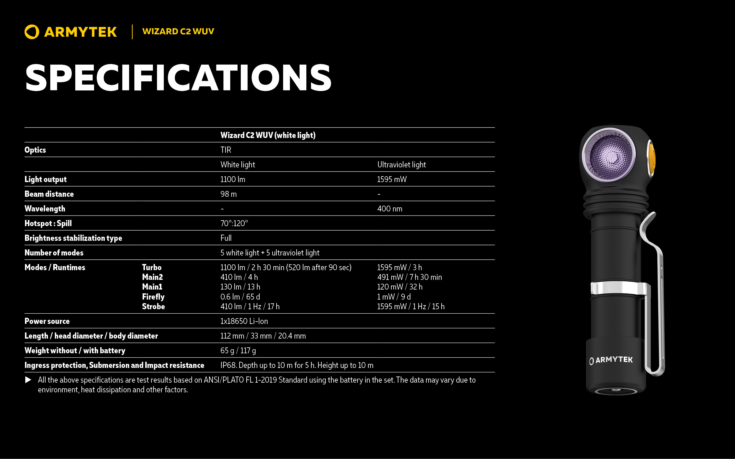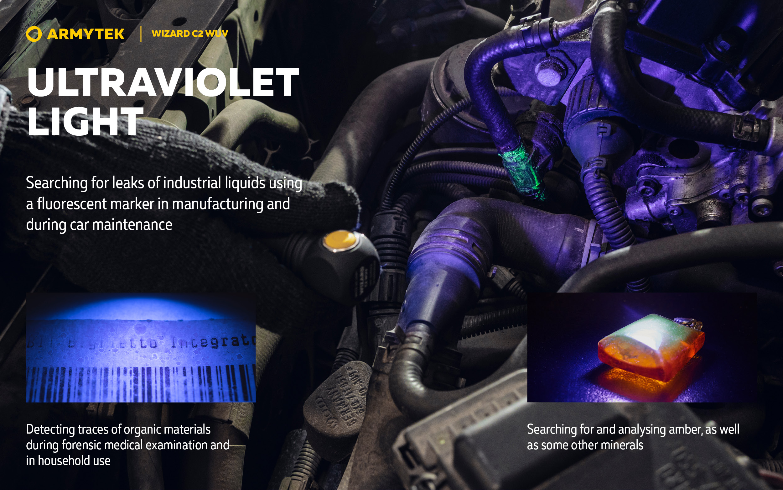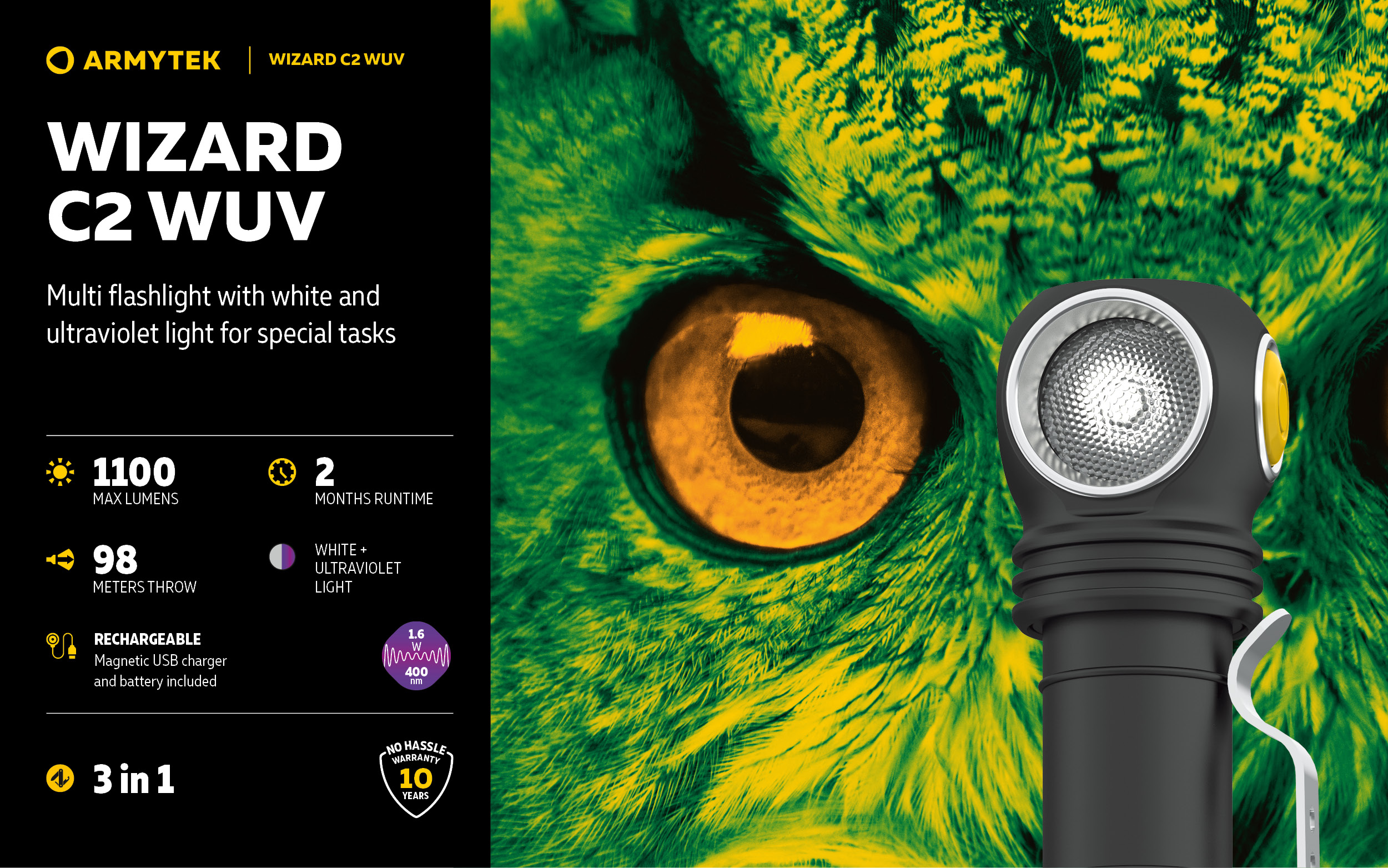 Wizard C2 WUV is a unique multi flashlight with four LEDs for impressive ultraviolet and white light.