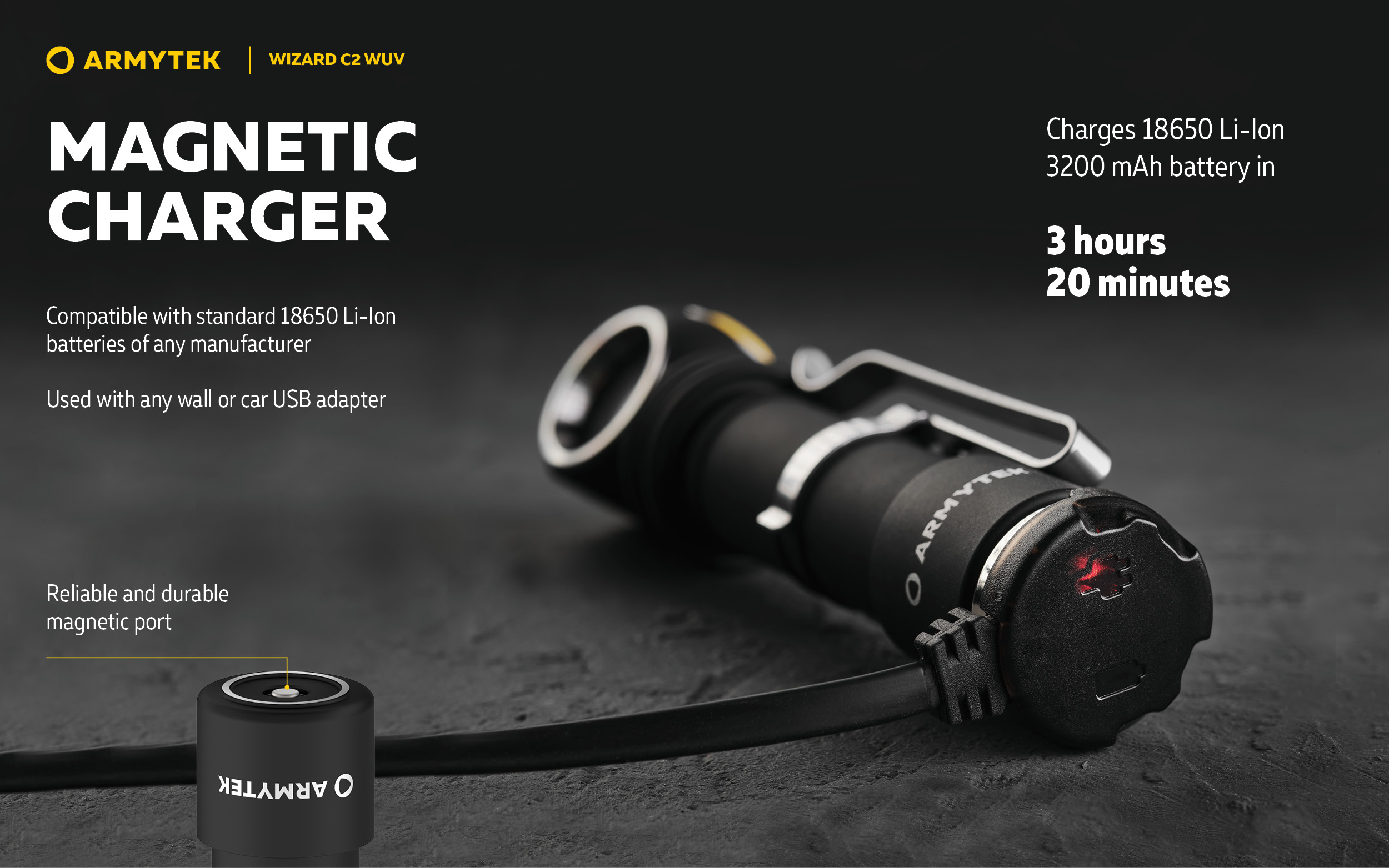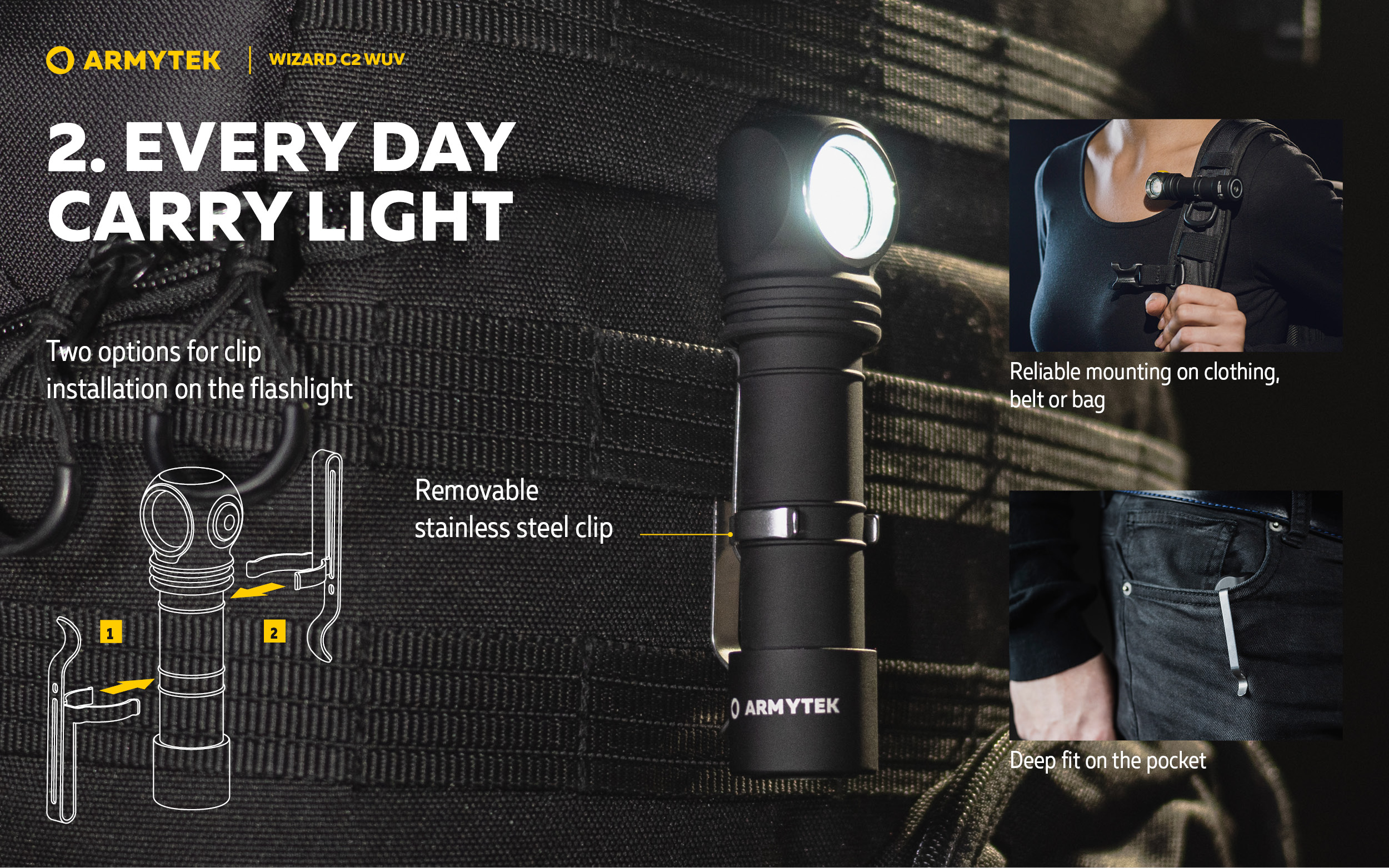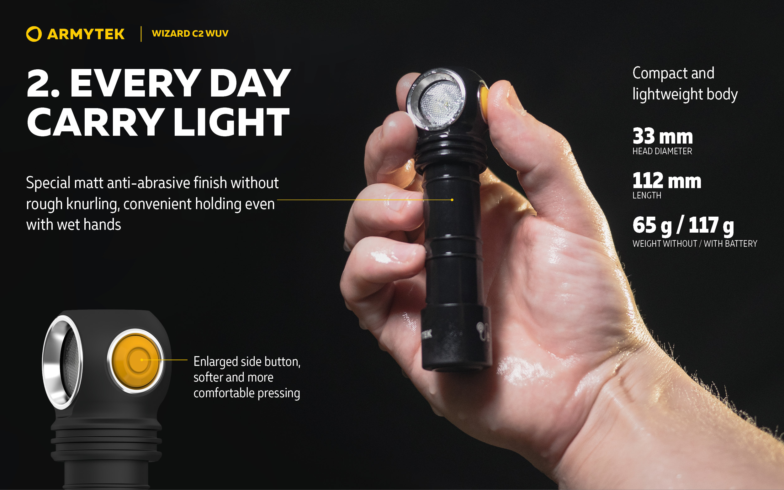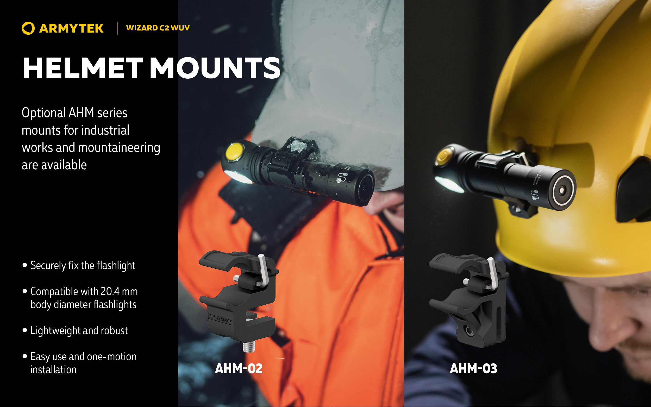The versatility of Wizard C2 WUV is determined by several fixation options: on the head with a reliable headmount, on any element of clothes with a steel clip, on any metal surfaces thanks to the magnet in the tailcap. The model is compatible with the universal mount ABM-01 and AHM series helmet mounts for industrial works and mountaineering.