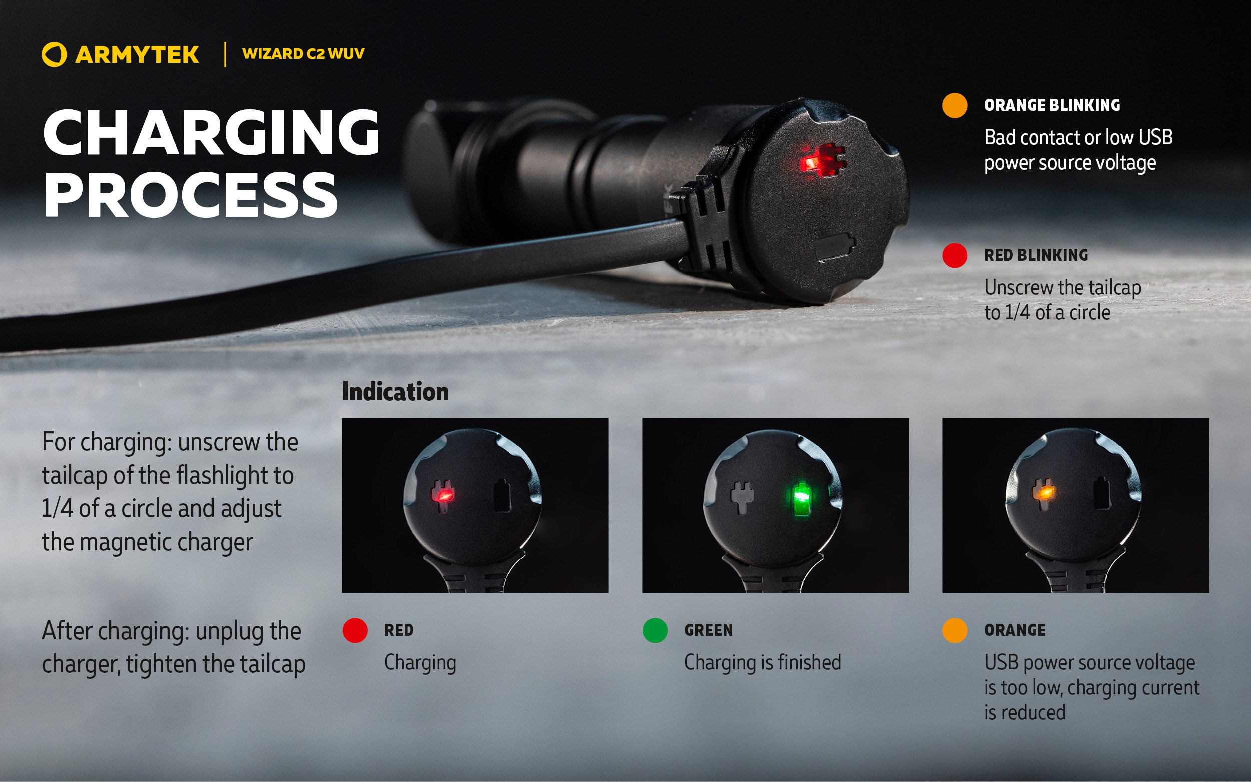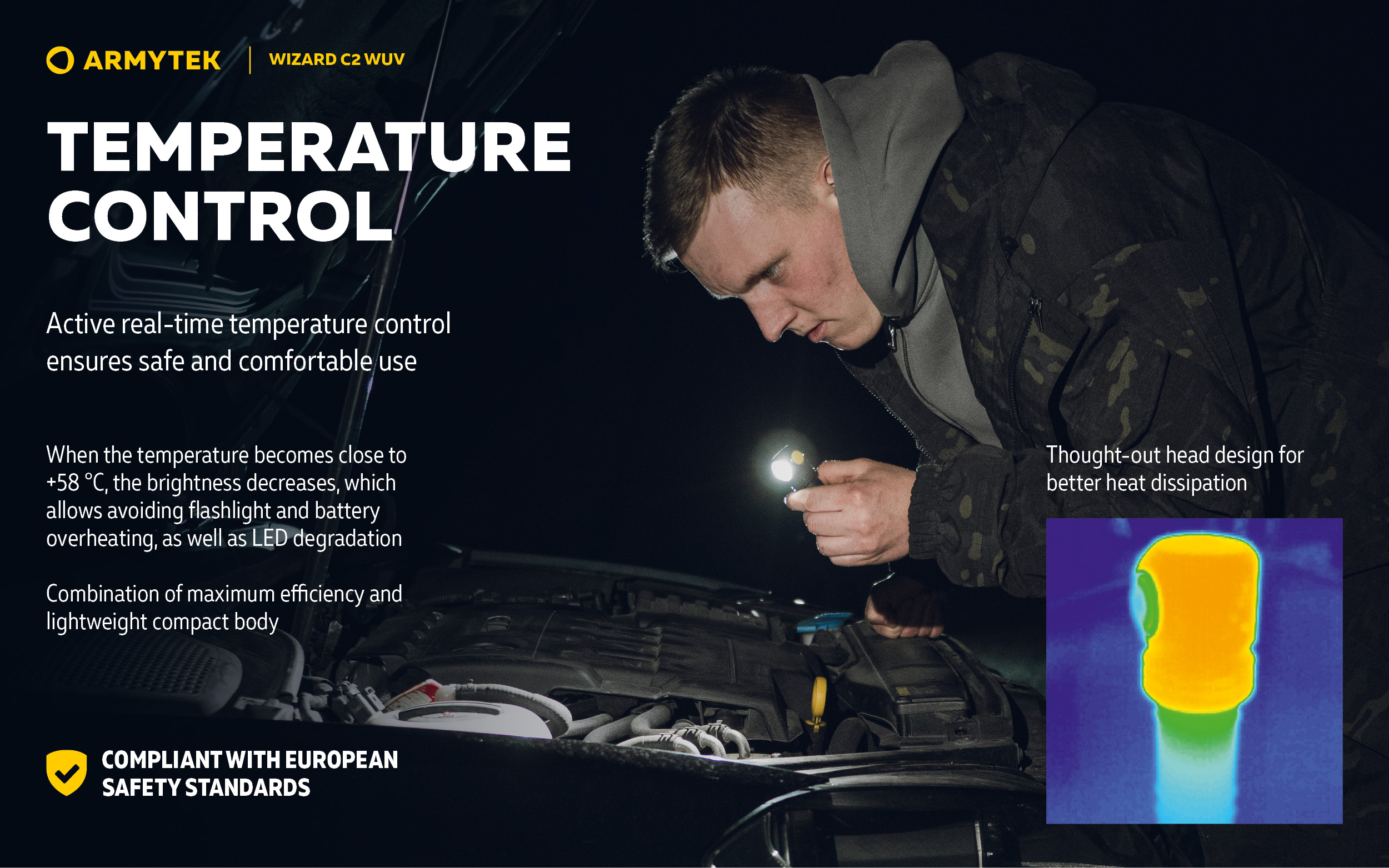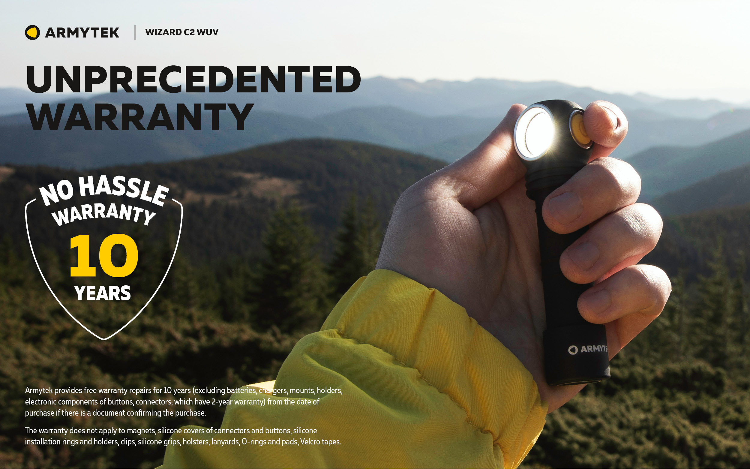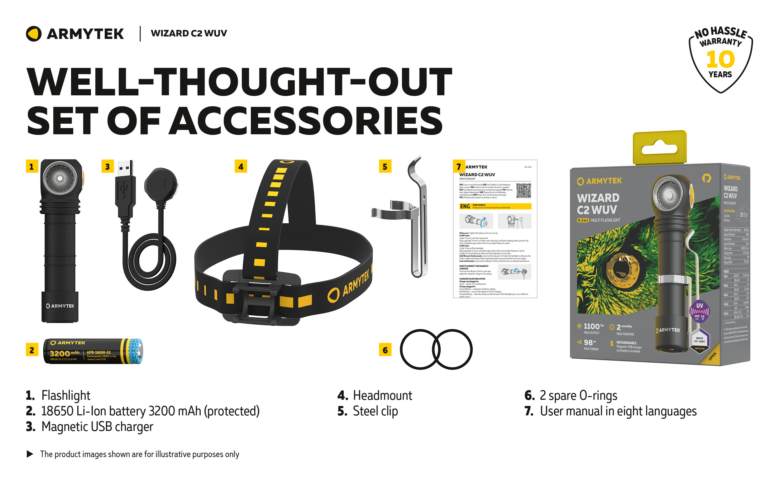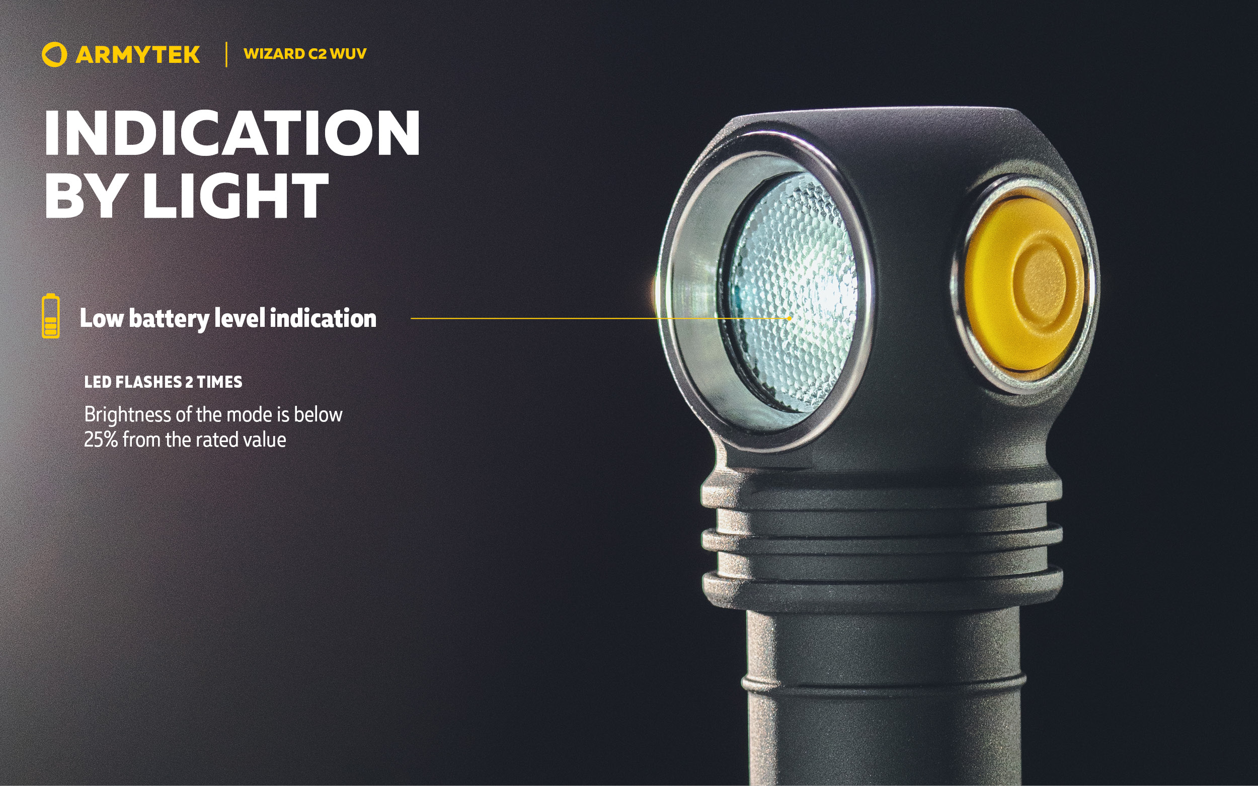 The versatility of Wizard C2 WUV is determined by several fixation options: on the head with a reliable headmount, on any element of clothes with a steel clip, on any metal surfaces thanks to the magnet in the tailcap. The model is compatible with the universal mount ABM-01 and AHM series helmet mounts for industrial works and mountaineering.