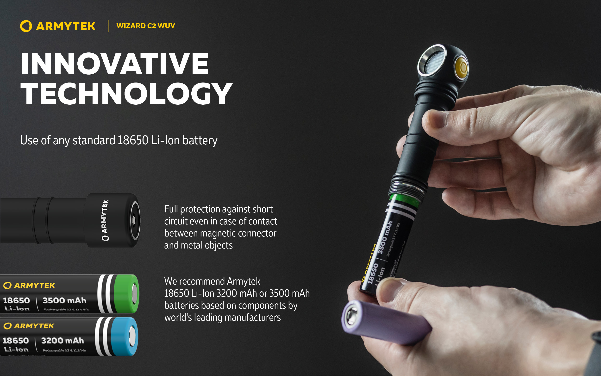 - Innovative technology allows using any standard 18650 Li-Ion battery. Full protection against short circuit even in case of contact between magnetic connector and metal objects.