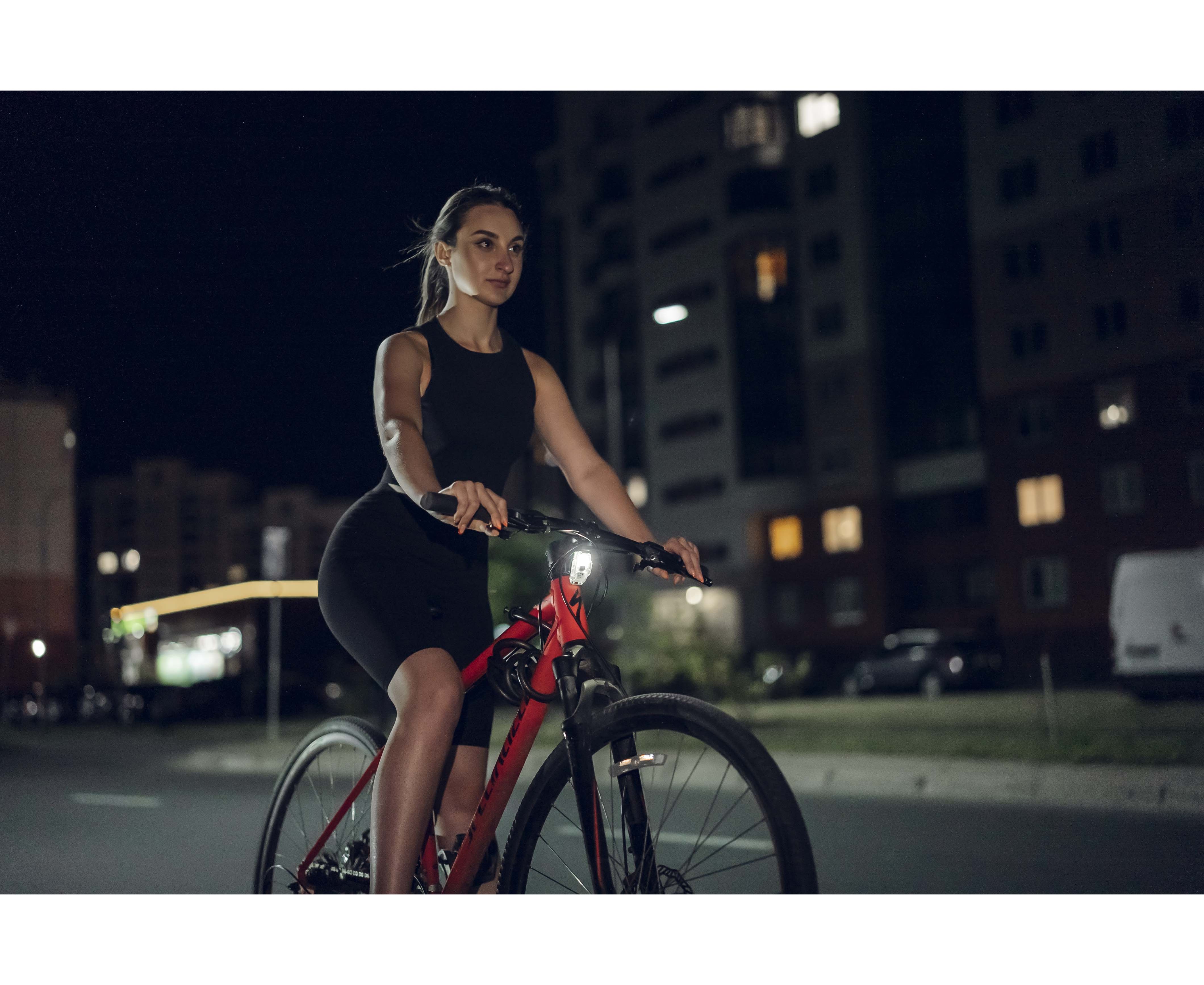 - Highly sensitive sensors detect bicycle deceleration, after which additional red LEDs turn on and the brightness of the flashlight increases to 43 lm