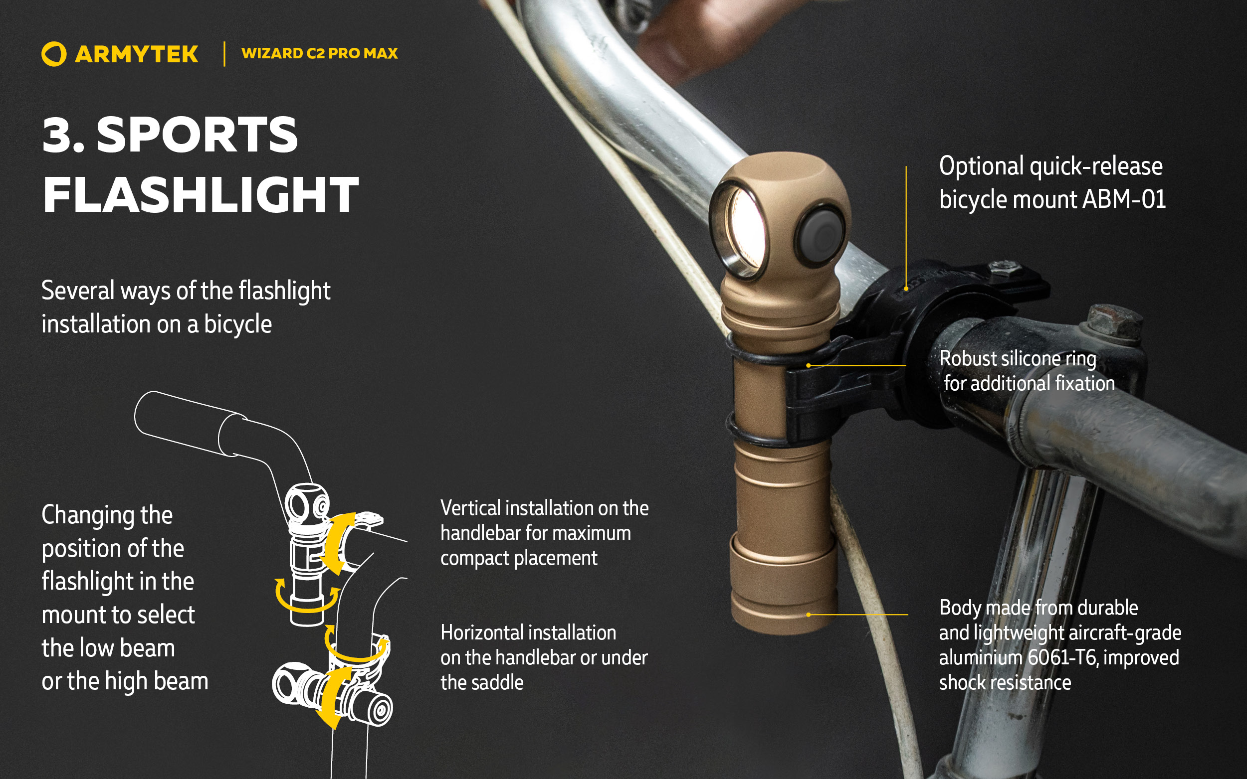 Thanks to the battery adapter in the set, the flashlight also works on the common 18650 Li-Ion power supply. Headmount, clip, holster, magnet in the tailcap and optional bike mount ABM-01 provide various attachment options. Wizard C2 Pro Max is also compatible with original hard hat mounts for industrial works and mountaineering.