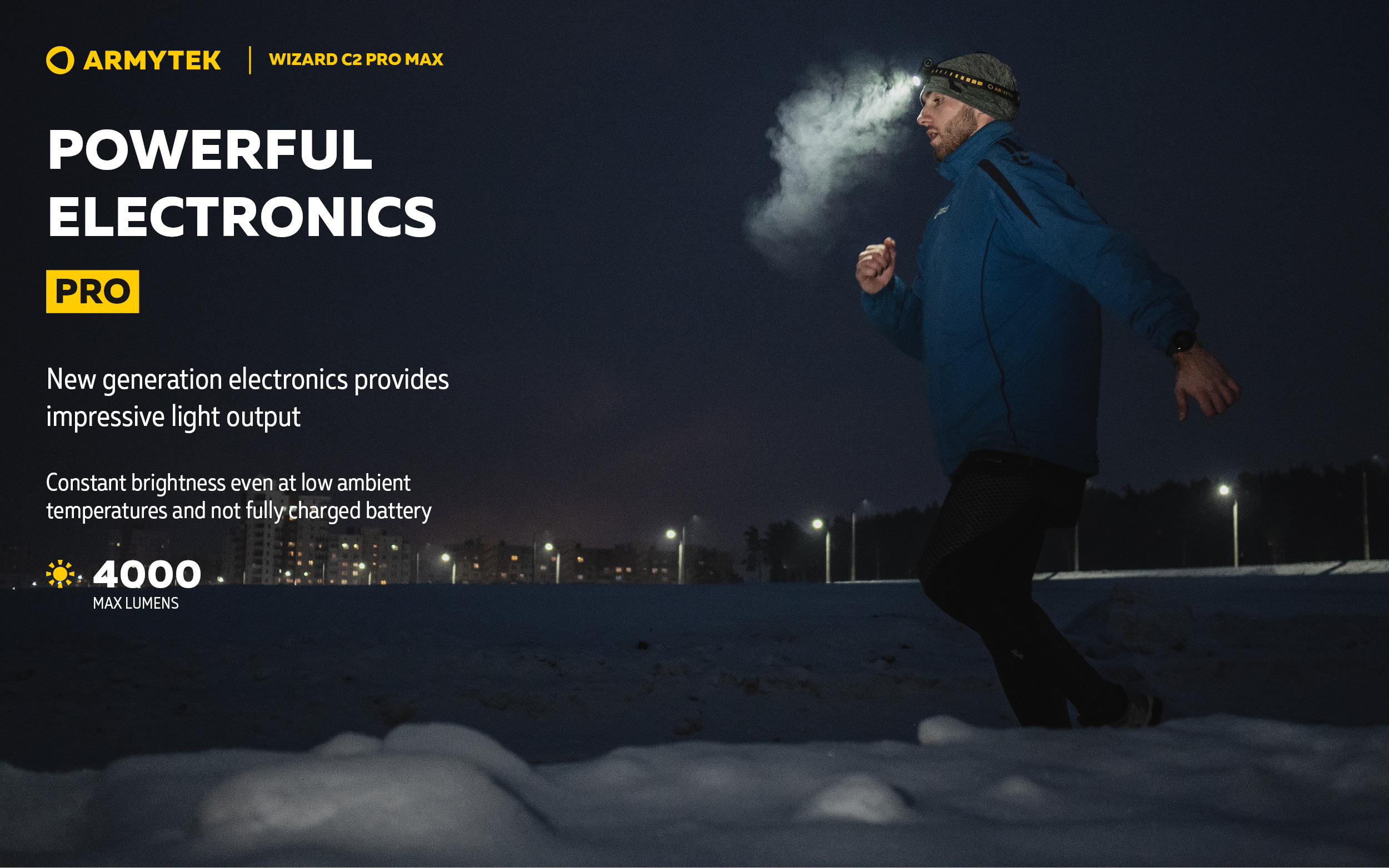 - Pro Max New generation electronics provides impressive light output of 4000 lumens. Constant brightness even at low ambient temperatures and not fully charged battery.