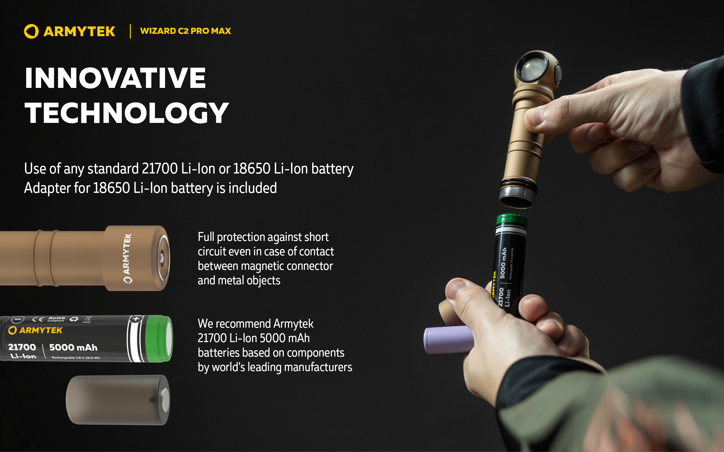 - Innovative technology allows using any standard 21700 Li-Ion or 18650 Li-Ion battery with 15A discharge current. Full protection against short circuit even in case of contact between magnetic connector and metal objects.