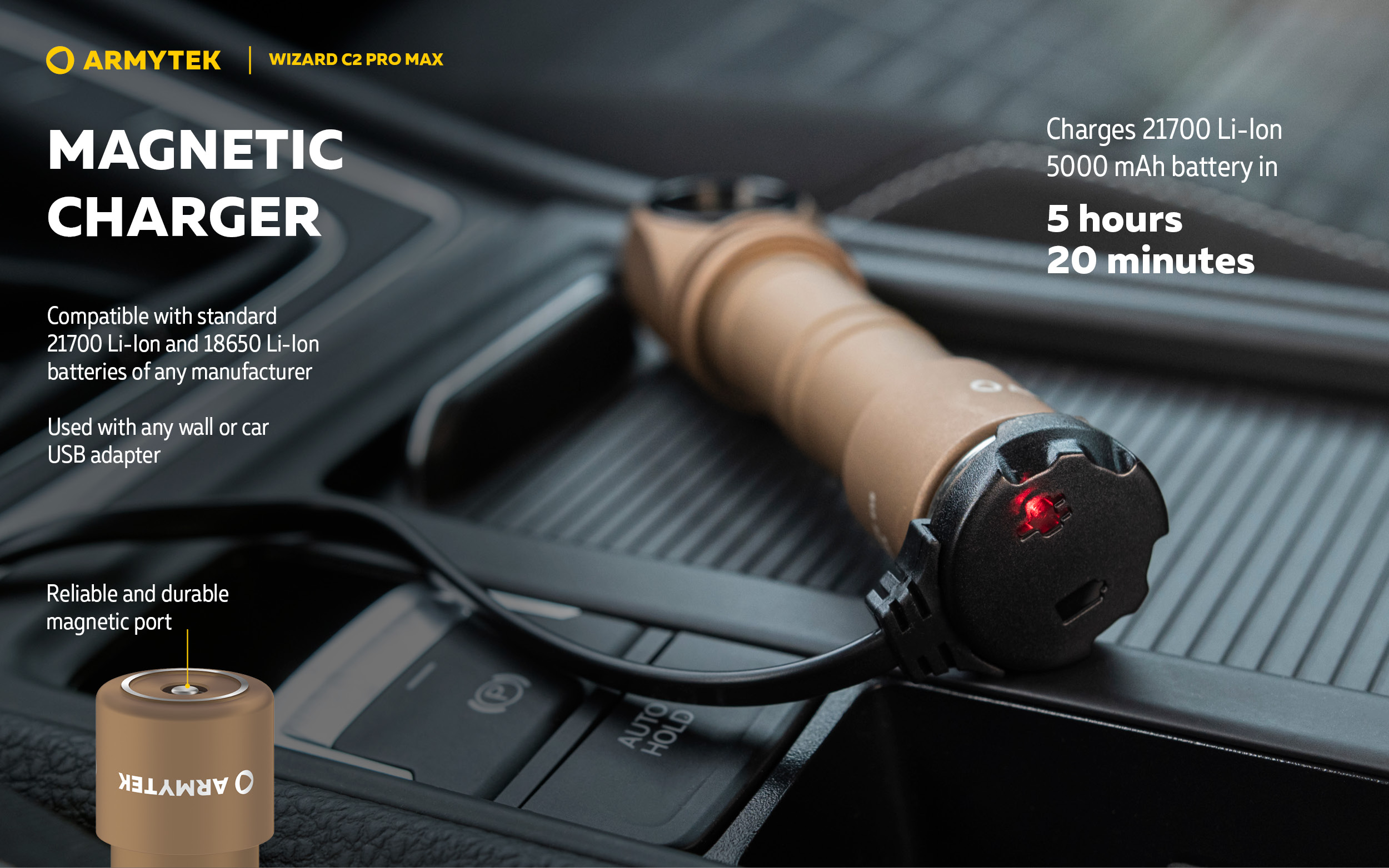 Fast magnetic charger: included 21700 Li-Ion 5000 mAh battery is charged in 5 h 20 min.